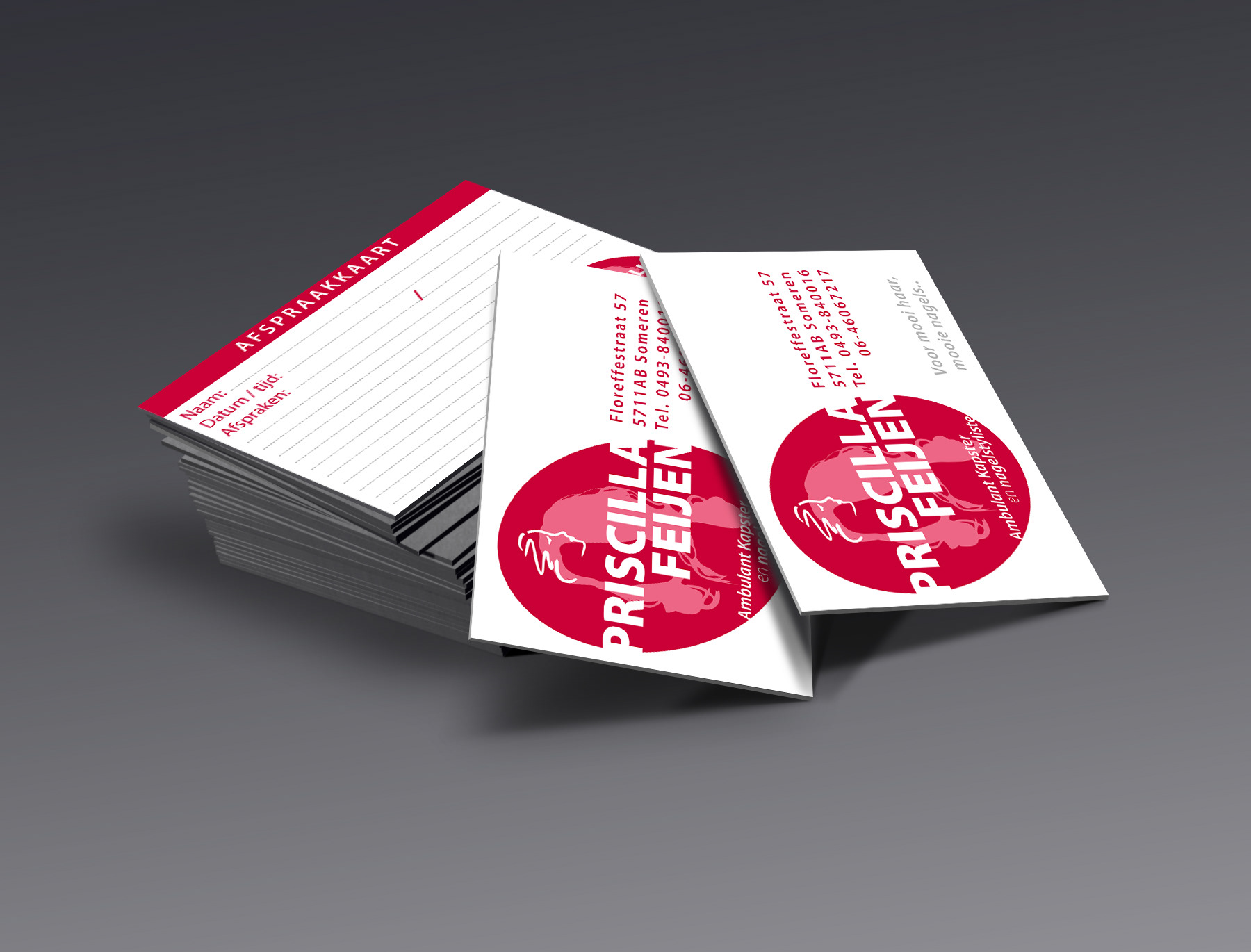 Ontwerp van logo en afsprakenkaartje voor Priscilla Feijen, ambulant kapster te Someren
