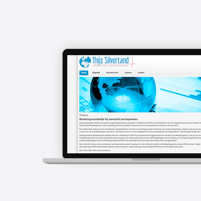 Bij Thijs Silvertand kunt u terecht voor aangifte inkomstenbelasting, aanvraag zorgtoeslag, boekhouden en het indienen van een bezwaarprocedure. Wij hebben zijn logo, huisstijl en website ontworpen.
